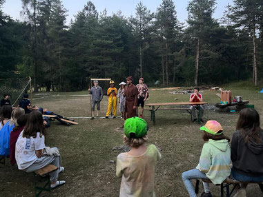 Auf dem Programm heute Morgen stand ein Orientierungslauf. Verschiedene Posten wurden im ganzen Dorf platziert und auf einer Karte eingezeichnet. Die Kinder mussten mithilfe der Karte die Posten finden und die gestellten Aufgaben lösen. Am Nachmittag spielten wir das Spiel ohne Grenzen. Bei diesem Spiel müssen verschiedene Aufgaben in einer Stunde gelöst sein, um die Belohnung zu bekommen. Dieses Ziel wurde leider nicht ganz erreicht. Am Abend machten wir es uns im Wald gemütlich mit einer Singrunde am Feuer.